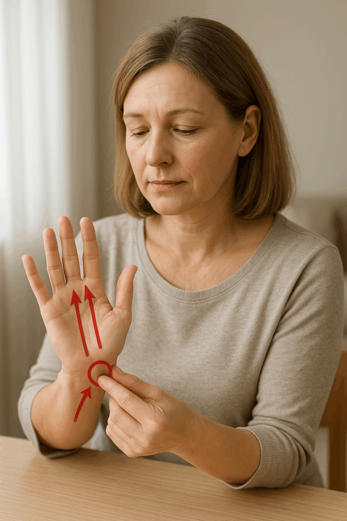 Next, it is recommended to treat the area just below the wrist joint. Set the frequency to 77 and hold the device’s electrodes in this area for 2 minutes on each hand.