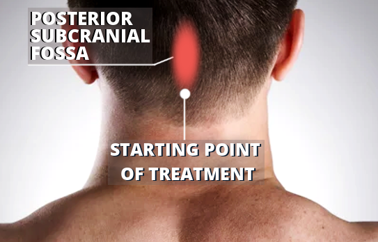 Apply the built-in electrode of the device on the region of the posterior subcranial fossa, where the atlanto-axial joint is located, i.e. where the skull ends.