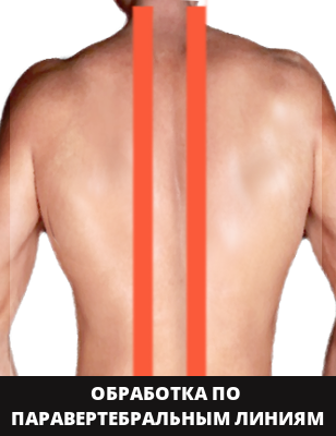 Воздействие также проводится сверху вниз, но не по самому позвоночнику, а по паравертебральным линиям.