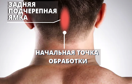 Приложите встроенный электрод аппарата на область задней подчерепной ямки, где находится атланто-аксиальный сустав, т.е. там, где заканчивается череп.