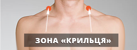 Зона «Крильця» знаходиться в області шиї, до неї примикає трапецієподібний м’яз і тут же виходить плечове сплетіння.
