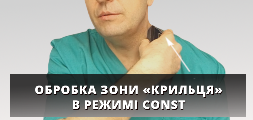 Для початку обробки зони «Крильця» необхідно включити прилад, активувати режим «CONST», встановити вбудований електрод приладу на проекцію зони та збільшити потужність за допомогою кнопки «+» на панелі приладу до відчуття трохи вище за комфортне.